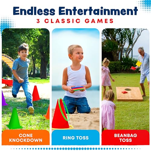 3-in-1 Carnival Games Set: 35-Piece Ring Toss Game for Kids with Cornhole Bean Bags, Cones, Whistles, Rings – Children’s Indoor/Outdoor Activities Toys for Yard, Lawn, Toddler Birthday Party